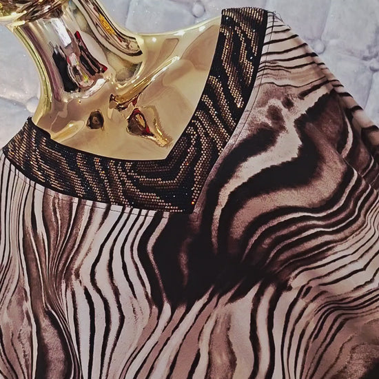Das dominierende Merkmal ist das beliebte Löwe-Tiermuster, das selbstbewusst, feminin und zeitlos wirkt. Wunderschöne goldene Zirkone ergänzen das Modell – sie funkeln sanft an Ausschnitt und Ärmeln und verleihen dem gesamten Kleidungsstück einen luxuriösen Touch. Der Ausschnitt betont die obere Körperhälfte vorteilhaft, und der fließende Schnitt schmeichelt selbst kurvigen Figuren.