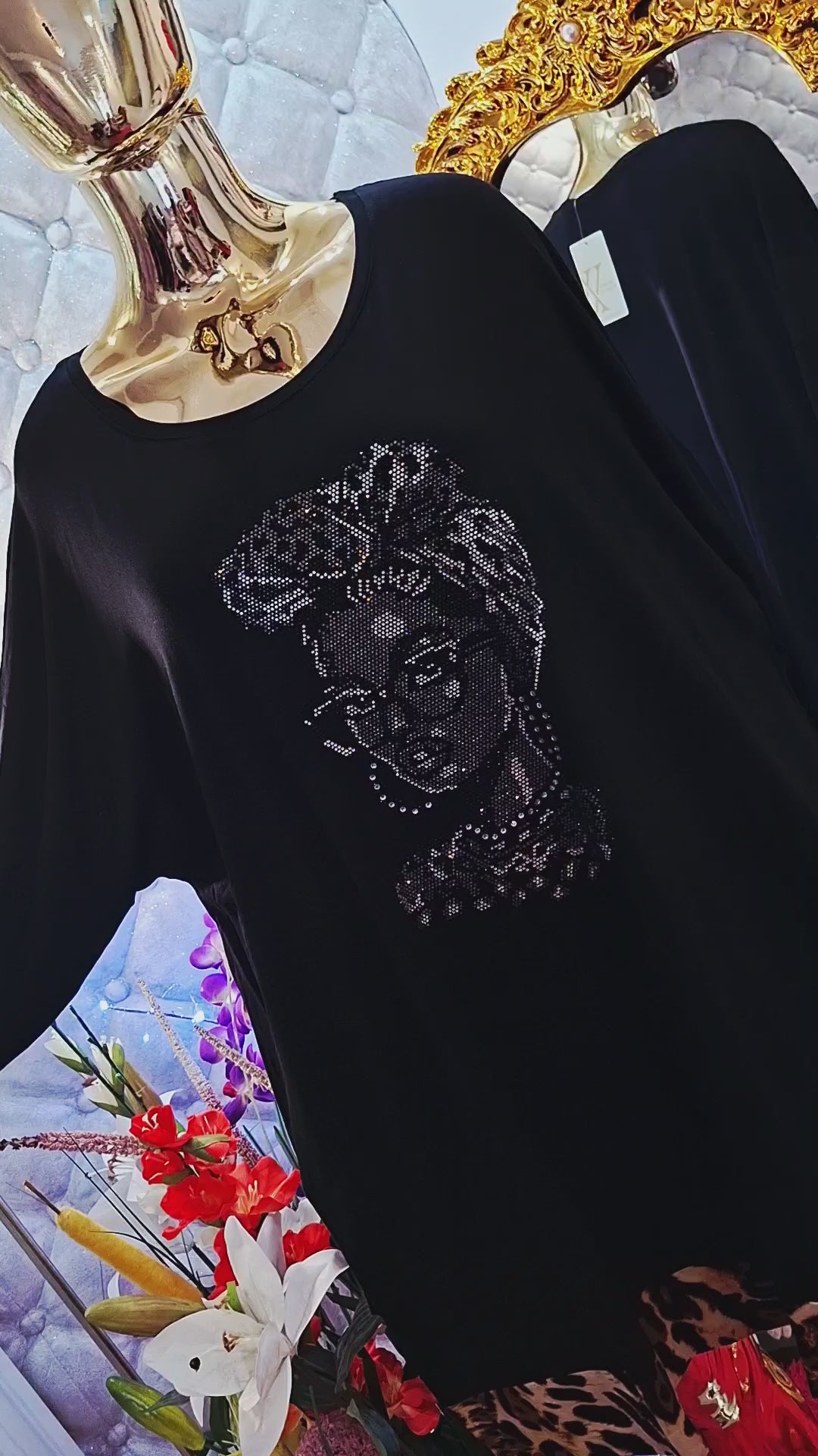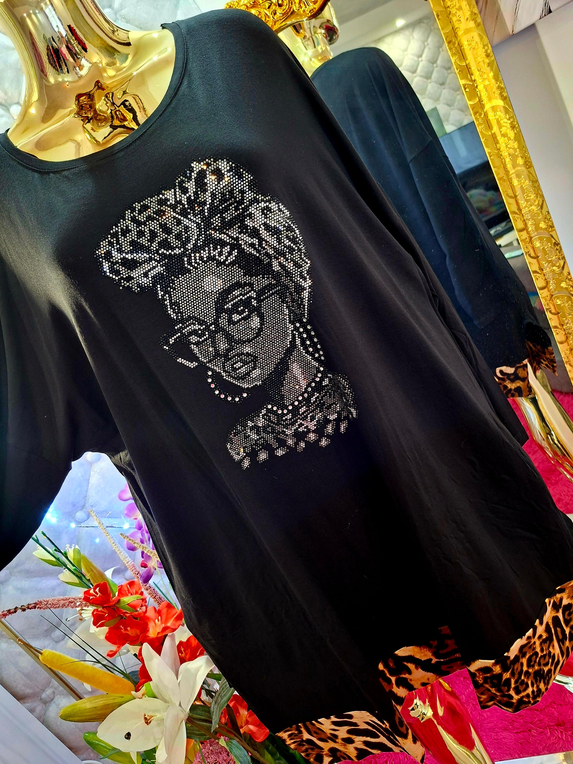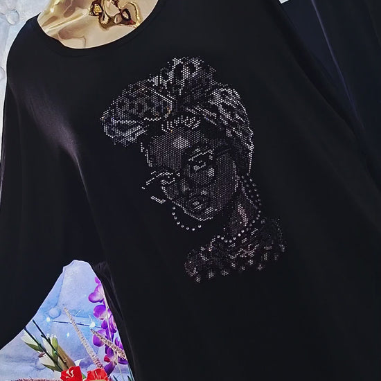 Táto nádherná nadrozmerná tunika je skutočným umeleckým kúskom, ktorý okamžite upúta pozornosť. Dominantou je elegantná dáma vpredu, bohato vyzirkonovaná do posledného detailu – samé zirkóny, ktoré vytvárajú luxusný, žiarivý efekt a robia z tuniky neprehliadnuteľný fashion skvost.